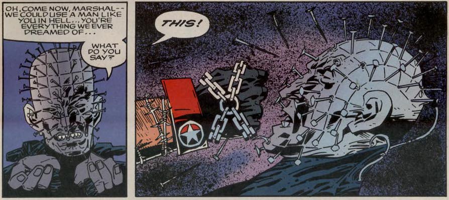 Harry D’Amour and his gang are close on his heels and he can now act as a witness to the fall of the Prince of Darkness and the climb to fame of Pinhead as the latter strips off Lucifer’s armor and puts it on his body.